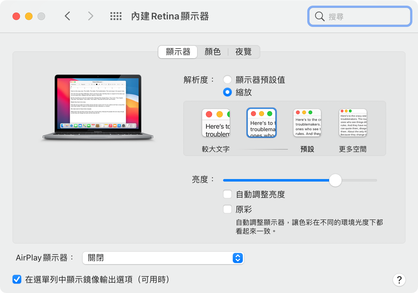 - 把螢幕解析度調成原生解析度的因數。如果是 13 吋機種的話,原生解析度是 2560 x 1600,那就把螢幕解析度設成 1280 x 800。如此一來,所有螢幕內容都會以整數倍數來渲染。13 吋預設的螢幕解析度是 1440 x 900,約為 1.78 倍渲染,會造成圖像跟字體的邊緣不那麼銳利。