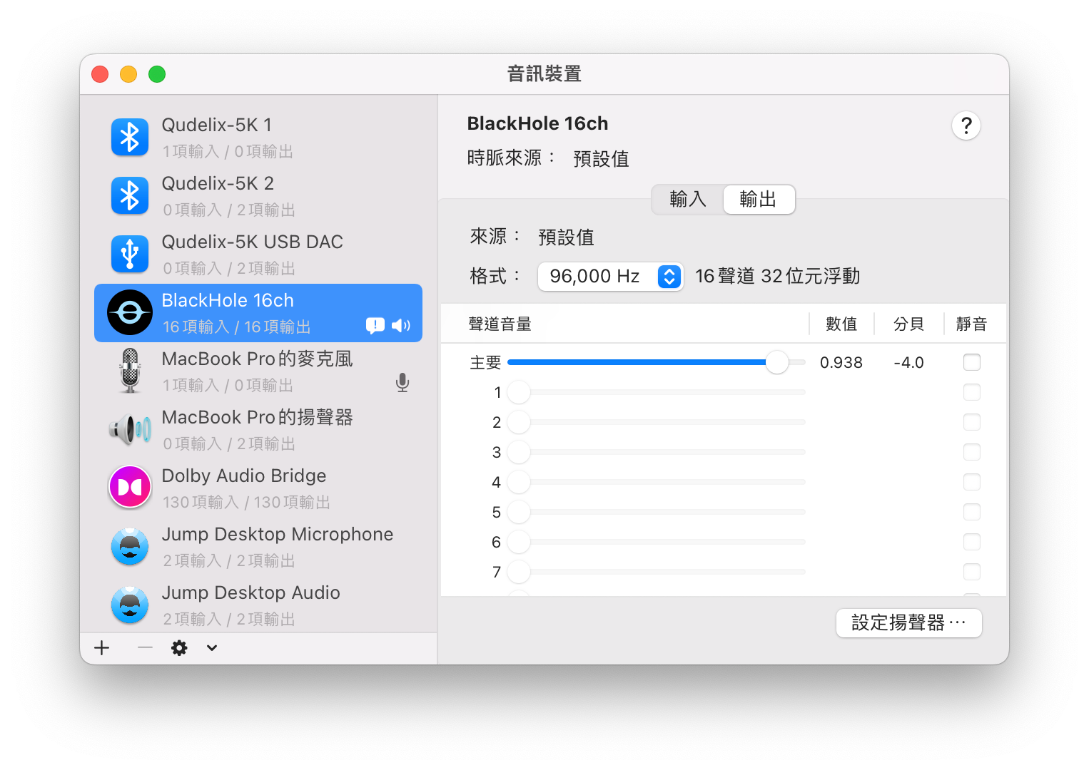 前面提到,音訊裝置要設定成環繞音效或全景音,也就是 5.1 聲道以上的格式,才可以讓 Apple Music 輸出 7.1 或 5.1 聲道的音軌。這需要我們去下載安裝 BlackHole,一個音訊路由 app。裝好之後,打開系統的「音訊 MIDI 設定」,左邊側邊欄的裝置列表裡,就會出現一個 BlackHole 16ch 裝置。