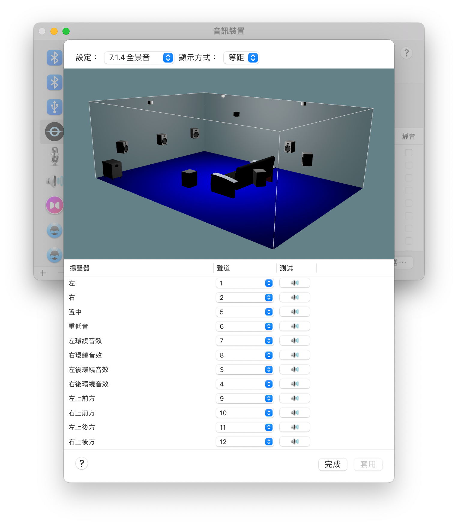 點選右下角的「設定揚聲器⋯」之後,就會跳出一個立體的音軌配置圖。在左上角的「設定」選單裡選擇「7.1.4 全景音」。