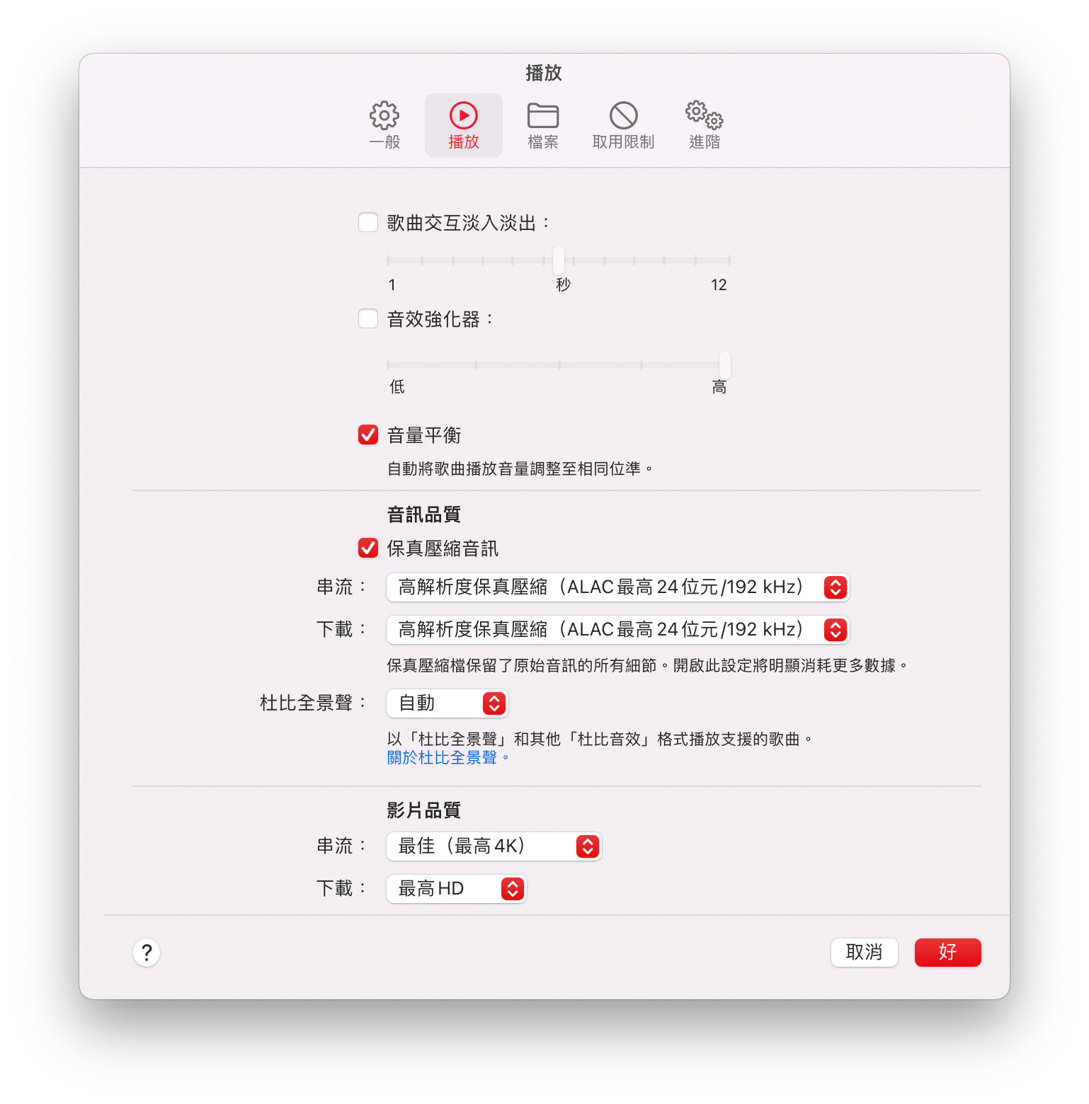 - Apple Music 裡的杜比全景聲要選「自動」,而且系統音訊裝置要至少 5.1 或 7.1 聲道,它才會輸出 5.1 或 7.1 聲道音軌。