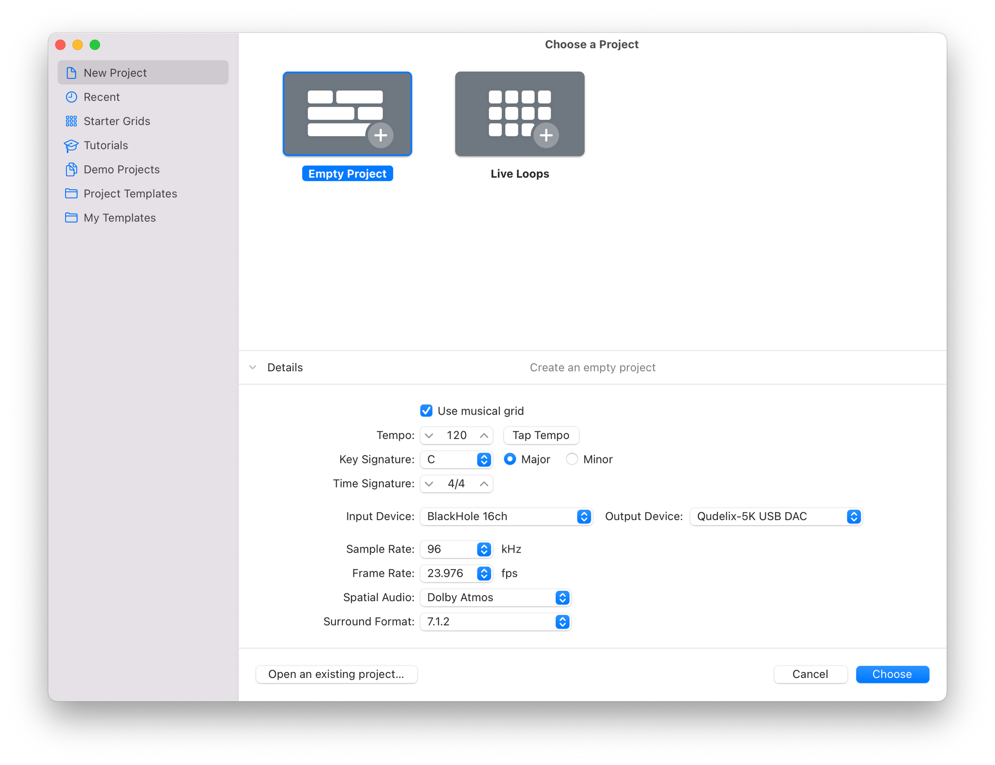 新建一個專案,設定裡 Input Device 選 BlackHole 16ch,Output Device 選你的輸出裝置,像是耳機或者 DAC 之類的。這邊會輸出成雙聲道,所以任何雙聲道裝置都可以。下面的 Spatial Audio 選 Dolby Atmos。