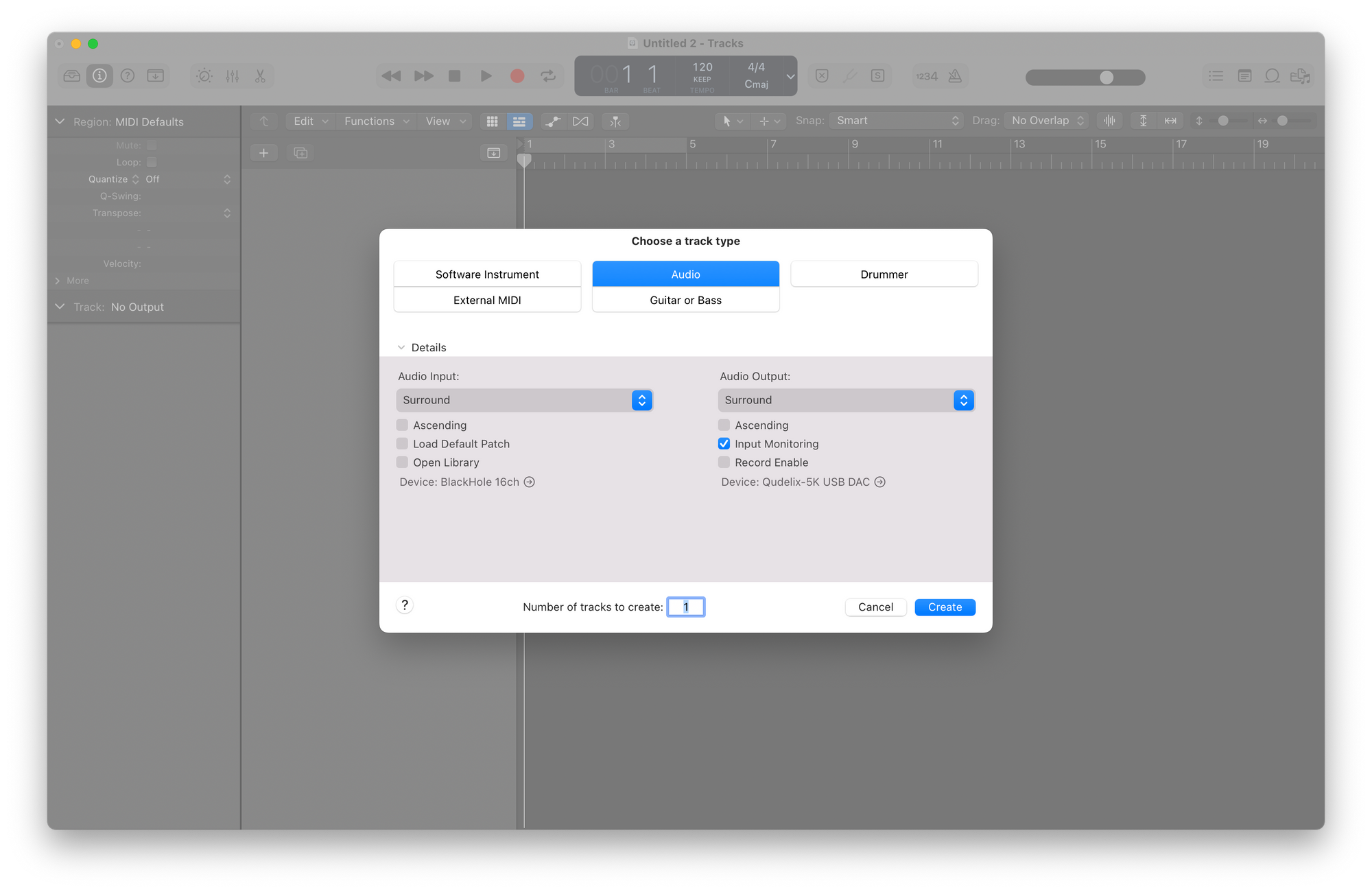選取「Choose」之後,app 畫面會跑出來,然後會要求新建一個音軌。這邊只要確認左邊的 Audio Input 是 Surround,左邊的 Device 是 BlackHole 16ch 就可以按下右下角的「Create」了。輸出是 Surround 或 Stereo 沒什麼影響。