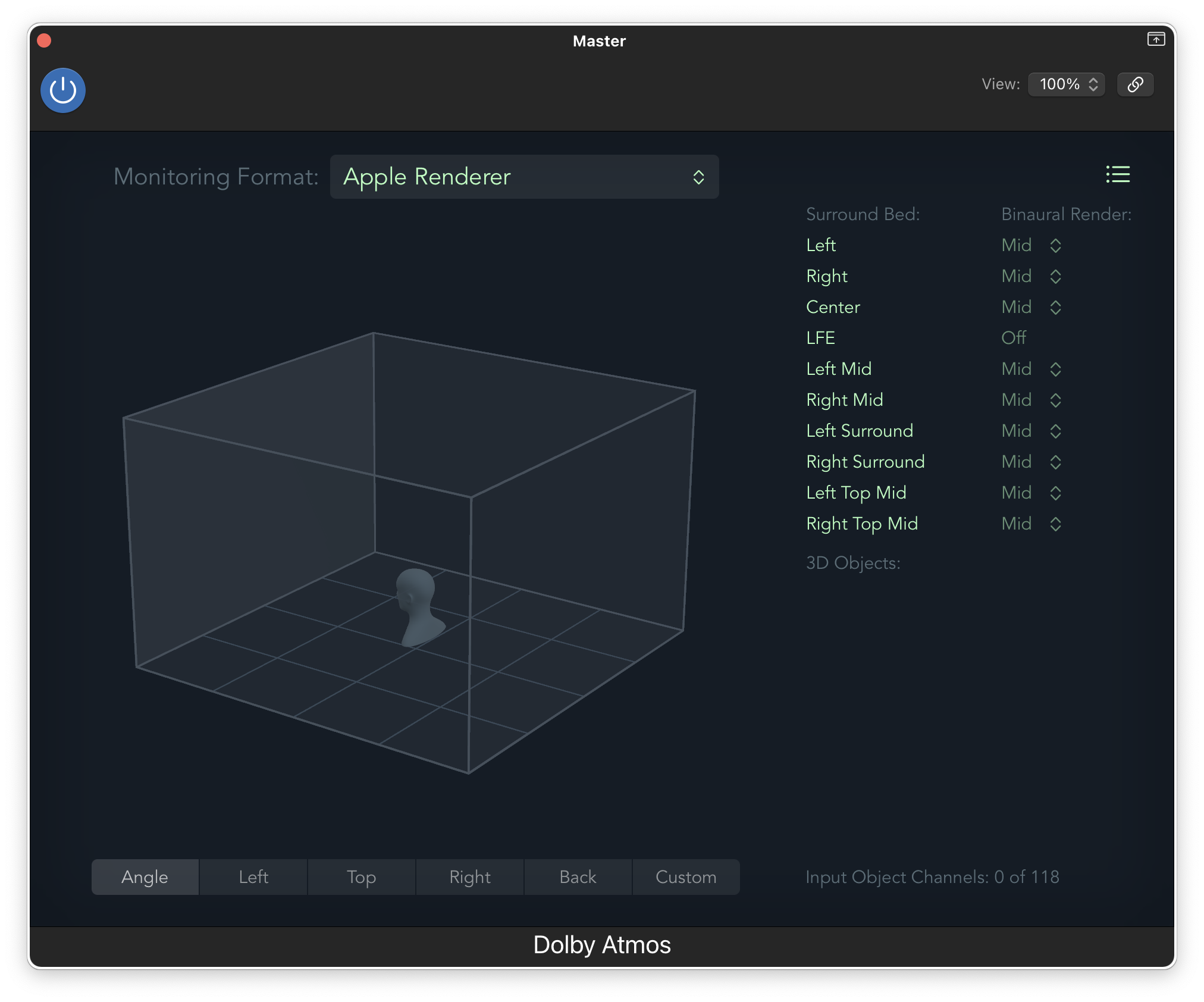 - 用 Logic Pro 來承接 BlackHole 的音訊輸出,並用它內建的 Dolby Renderer 來做雙耳(虛擬環繞)渲染。